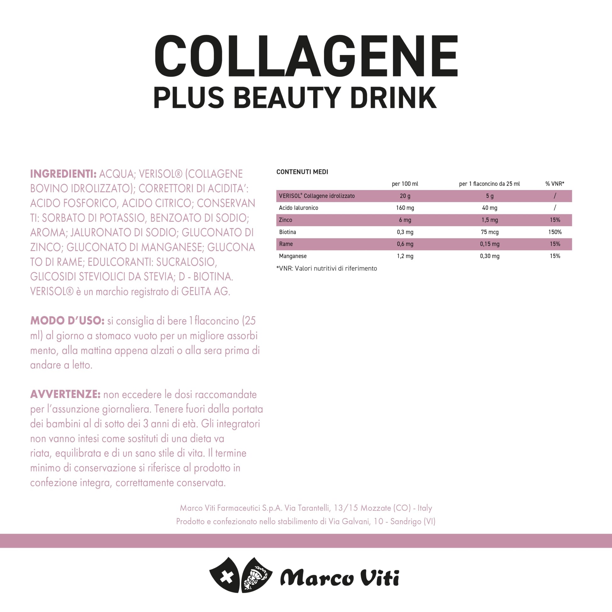 - CONTENUTO: Collagene Beauty Drink Plus è un innovativo integratore alimentare liquido formulato dai laboratori Marco Viti. Contiene 10 flaconcini da 25 ml, ricchi di ingredienti attivi come collagene idrolizzato, acido Ialuronico, biotina, zinco e rame.