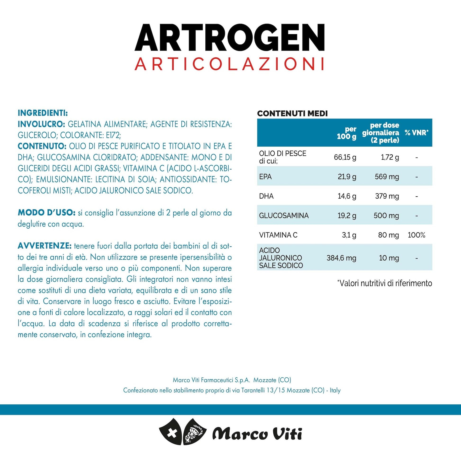 Involucro: gelatina alimentare; agente di resistenza: glicerolo; coloranti: E171, E172; Contenuto: olio di PESCE purificato e titolato in EPA e DHA; glucosamina cloridrato; addensante: mono e di gliceridi degli acidi grassi; vitamina C (acido L-ascorbico); emulsionante: lectina di SOIA; antiossidante: tocoferoli misti; acido jaluronico sale sodico.