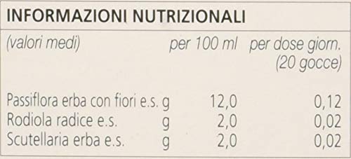 Ingredienti: acqua demineralizzata, glicerolo, estratto secco di Passiflora erba con fiori (Passiflora incarnata) titolato al 3.5% in vitexina, estratto secco di Rodiola radice (Rhodiola rosea) titolato al 3% in rosavine e 1% in salidroside, estratto secco di Scutellaria erba (Scutellaria lateriflora), conservante: potassio sorbato E202; acidificante: acido citrico E330.