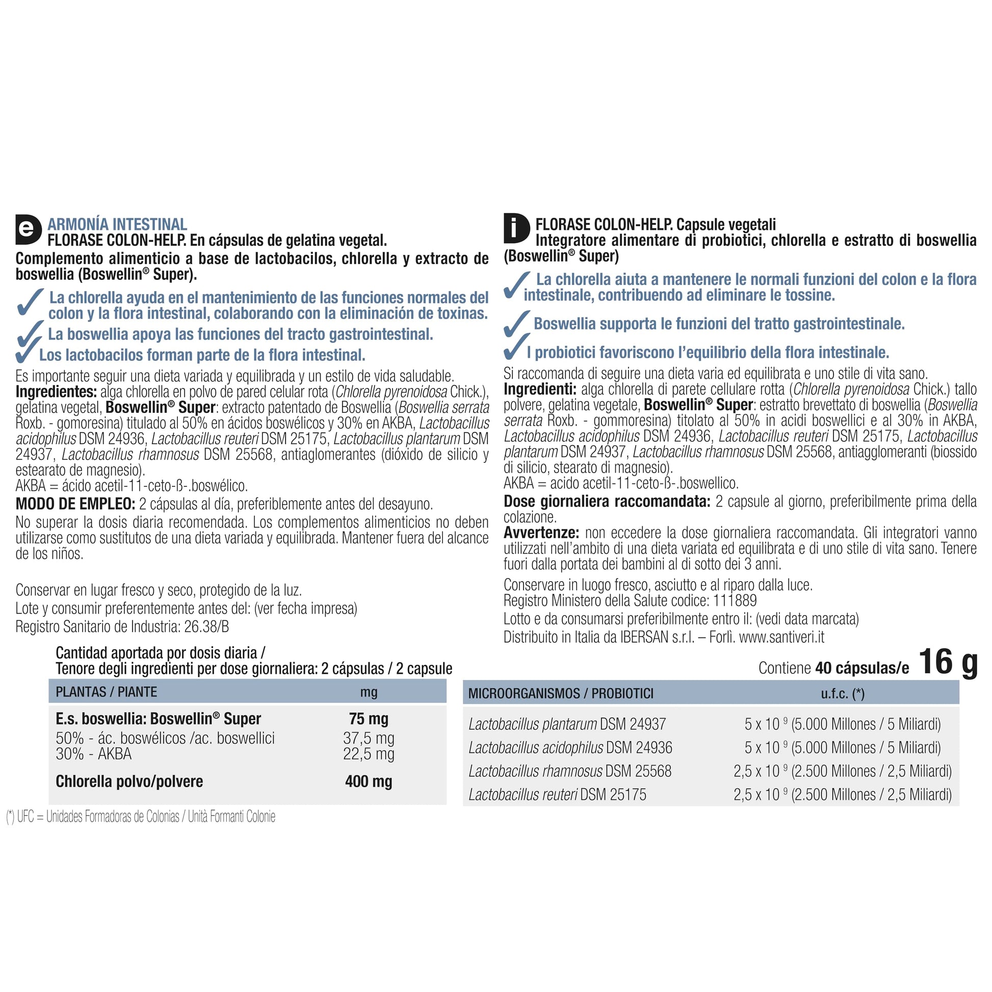 alga chlorella di parete cellulare rotta (Chlorella pyrenoidosa Chick.) tallo polvere, gelatina vegetale, Boswellin Super: estratto brevettato di boswellia (Boswellia serrata Roxb. - gommoresina) titolato al 50% in acidi boswellici e al 30% in AKBA, Lactobacillus acidophilus DSM 24936, Lactobacillus reuteri DSM 25175, Lactobacillus plantarum DSM 24937, Lactobacillus rhamnosus DSM 25568, antiagglomeranti (biossido di silicio, stearato di magnesio). AKBA = acido acetil-11-ceto-B-boswellico.