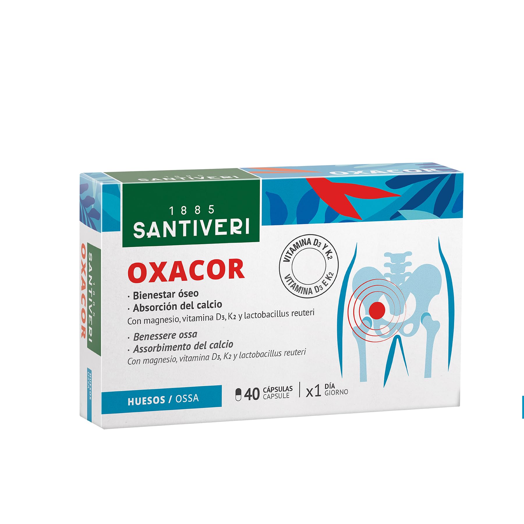 Santiveri Oxacor K2 è un integratore alimentare per la corretta manutenzione del normale benessere di ossa e articolazioni. Promuove l'assorbimento di calcio e fosforo. Rimuove l'inizio dei radicali liberi, mentre nella sua funzione vitaminica consente alle ossa di crescere omogeneo. Il magnesio interviene nella coagulazione del sangue e nel metabolismo di lipidi, proteine e carboidrati e consente la produzione di energia. Promuove la trasmissione di impulsi nervosi e migliora quindi le funzioni del sistema nervoso. È una cura se soffri di problemi con il sistema gastro -intestinale.